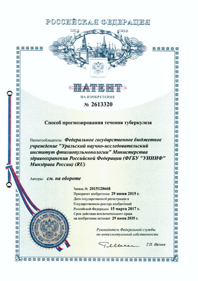Поздравляем Сабадаш Елену Венидиктовну, Скорнякова Сергея Николаевича, Медвинского Игоря Давыдовича, Павлова Владимира Александровича, Егорова Евгения Анатольевича, Фадину Ольгу Владимировну, Новикова Бориса Ивановича и Дьячкова Илью Андреевича с получением патента на изобретение «Способ прогнозирования течения туберкулеза».