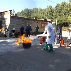 После завершения эвакуации и условного тушения пожара было организовано обучение сотрудников учреждения правилам пользования огнетушителями с практическими действиями.