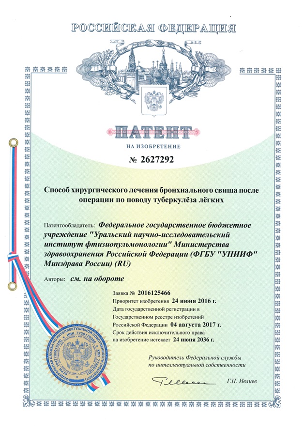 Поздравляем с получением патента на изобретение «Способ хирургического лечения бронхиального свища после операции по поводу туберкулеза легких» Баженова Александра Викторович, Мотуса Игоря Яковлевича с соавторами.