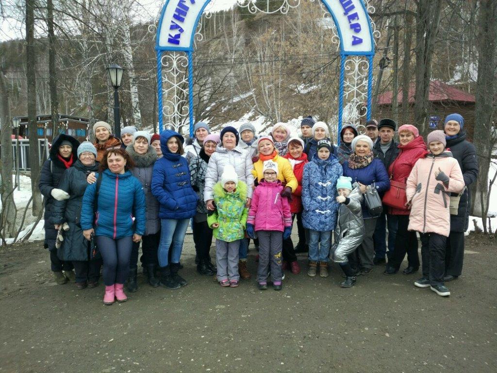 После наш путь продолжился до Кунгурской пещеры. Протяжённость маршрута в самой пещере составил 1300 м, среднее время прохождения – 1 час 20 минут. За это время путешественники увидели 20 гротов, прошли через три времени года: зиму, весну, осень и снова зиму в последнем гроте «Вышка». Успели полюбоваться снежными кристаллами «Бриллиантового» грота, ледяными сталагмитами и сталактитами гротов «Полярный», «Крестовый», «Вышка», а также незамерзающими озерами гротов «Дружбы народов» и «Длинный». Причудливой «работой» воды, когда среди каменного хаоса туристы легко могут узнать в гроте «Руины Помпеи» каменную черепаху, крокодильчика, и других животных. Услышали рассказ о том, как образовалась Ледяная пещера, кто её изучал, осваивал, а также интересные легенды связанные с пещерой: о Ермаке, о «Дамских слёзках», и т.д.