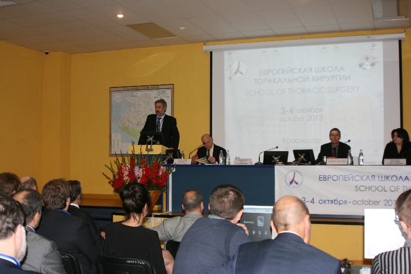 С 3 по 4 октября 2013 года в г. Краснодаре состоялась очередная «Европейская школа по торакальной хирургии», которая проводилась с участием ведущих специалистов Европейского общества торакальных хирургов из Европы и России (В.А. Порханов, П.К. Яблонский, В.Д. Паршин, А.А. Акопов, К.Г. Жестков, Д.Б. Гиллер, Ж.Массар, П.Тома, М.Мюллер, Г.Варела, К.Папажионопулос).